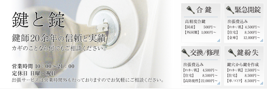| サービス内容 | 鍵開け、鍵交換、鍵修理、鍵作成、鍵の新規取付、補助錠、電子錠 |