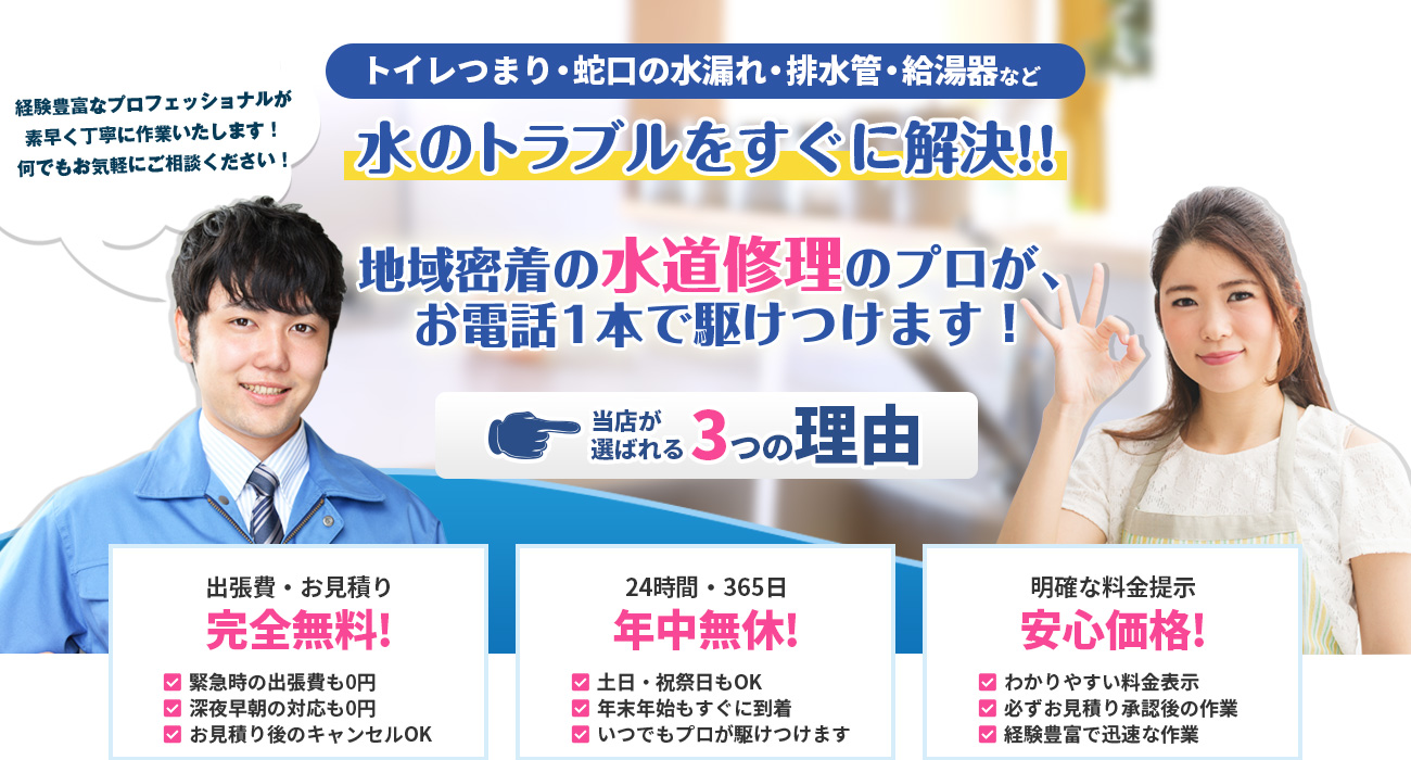| サービス内容 | 水漏れ・つまり、水道全般の工事・修理 |