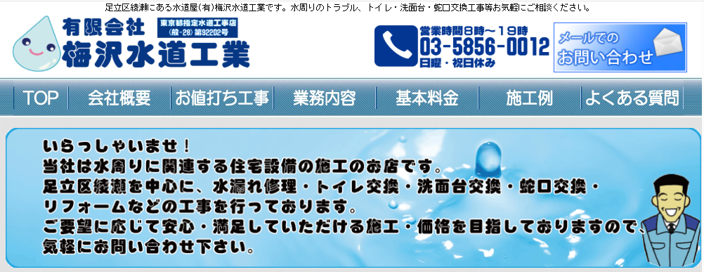 | 運営会社 | 有限会社 梅沢水道工業 〒120-0005 東京都足立区綾瀬 6-25-12 |