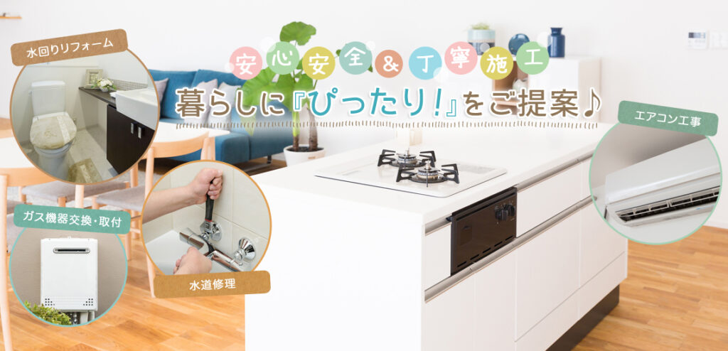 | サービス内容 | 水道トラブル、水道修理、水回りリフォーム、給排水衛生設備、ルームエアコン、業務用エアコン、エアコン洗浄、電化製品の販売、給湯器交換・取付、ガスコンロ交換・取付 |