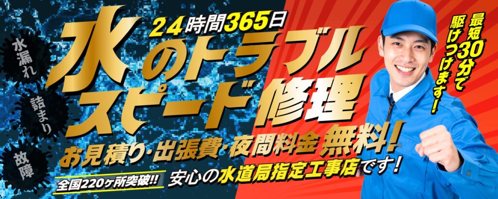 | サービス内容 | トイレつまり・水漏れなど、あらゆる水回りのトラブル 排水口のつまりやシャワー・蛇口の水漏れ 洗面台のつまりや蛇口の水漏れ、キッチントラブルの修理・リフォーム、水道や蛇口の水漏れ・凍結の修理 |
