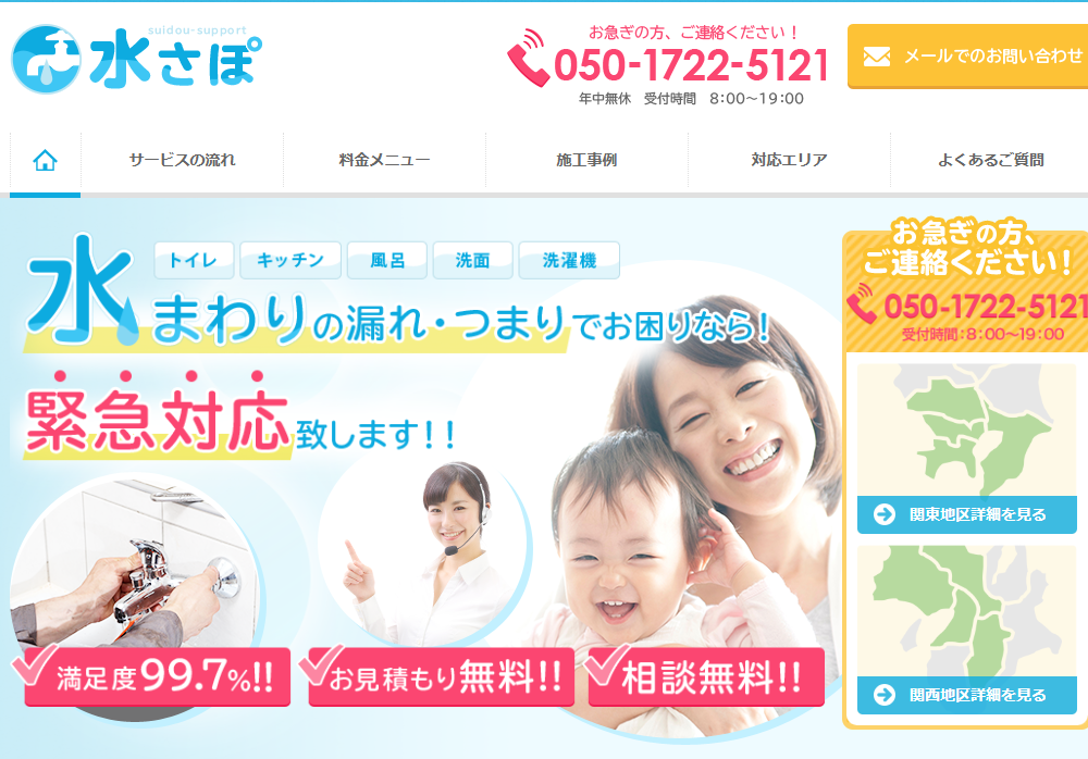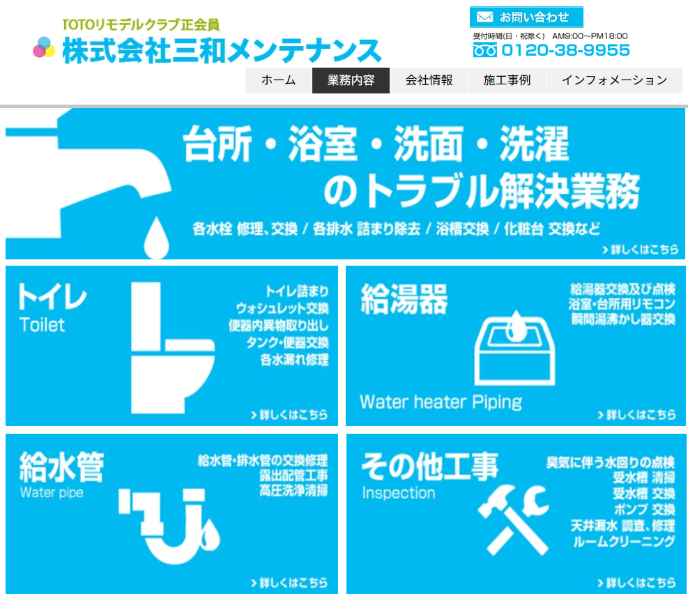 | サービス内容 | トイレ・お風呂・キッチン・洗面所、ポンプ・給湯器、屋外・水栓柱 |